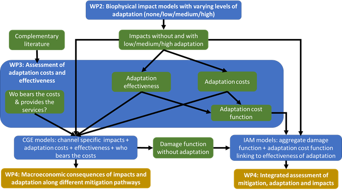 Figure 1: Data and information flow from sectoral level assessment of climate impacts and adaptation to macroeconomic modeling.