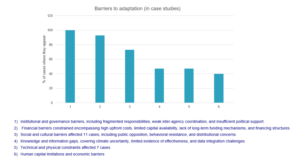 Common findings emerged across the case study contexts. Perhaps most surprisingly, technological constraints were not the primary barriers to adaptation. While technical and physical challenges were identified in approximately half the cases (47%, 7/15), they rank only fifth among barrier types. This finding contradicts the often-held perception that adaptation is primarily limited by technological readiness or physical constraints. Instead, institutional and governance barriers emerge as the dominant constraint, present in all 15 case studies (100%). These include for instance fragmented responsibilities, weak inter-agency coordination, and lack of political support. Financial barriers follow closely as the second-ranking constraint at 93% (14/15 cases), encompassing high upfront costs of adaptation measures, limited capital availability, lack of long-term funding mechanisms, and financing structures that favour incremental over transformative approaches.