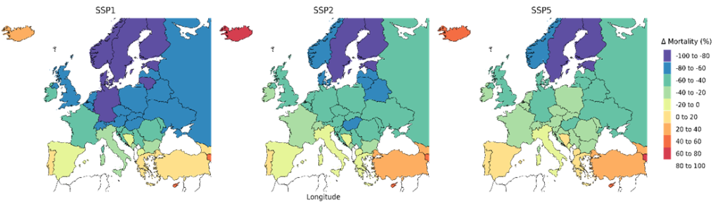 The study aimed to quantify how future climate change, air pollution, and demographic developments interact to influence health outcomes in Europe. It combined three Shared Socioeconomic Pathways (SSPs)—SSP1-2.6 (sustainability), SSP2-4.5 (middle-of-the-road), and SSP5-8.5 (fossil-fuel intensive)—with climate projections from CMIP6 models. These scenarios represent a wide range of potential futures, from strong mitigation and sustainability to high emissions and limited climate action.