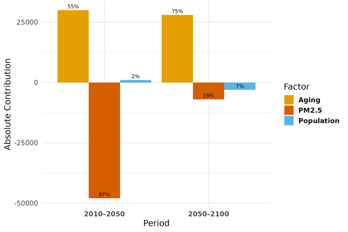 Demographic changes, particularly population ageing and urbanization, play a central role in shaping future health risks. Even as air quality improves, the vulnerability to pollution-related diseases increases in an ageing population. By 2100, the majority of excess mortality is projected to occur in older age groups, especially those over 80 or 90 years old.